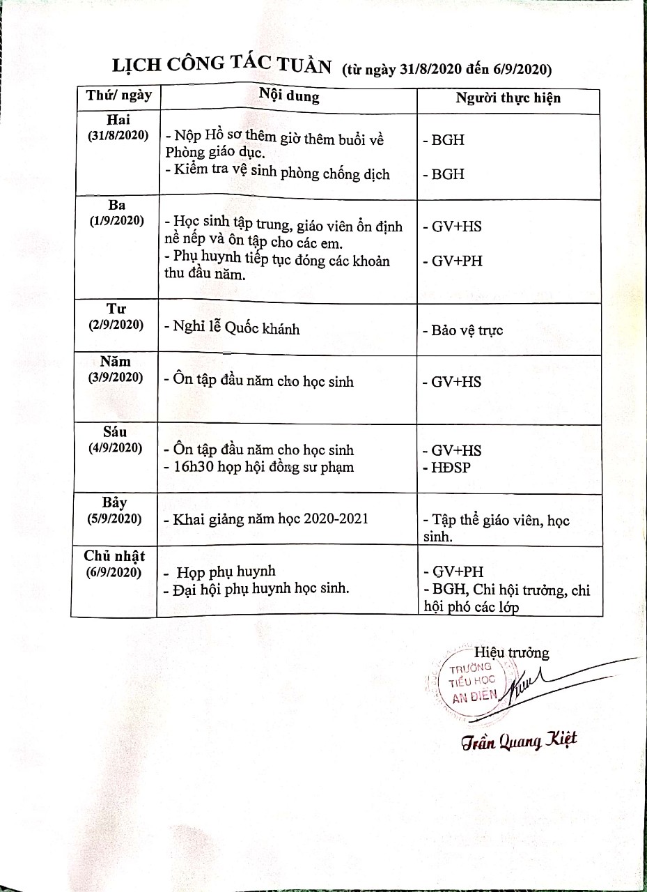 Lịch công tác tuần đầu năm học 2020 - 2021