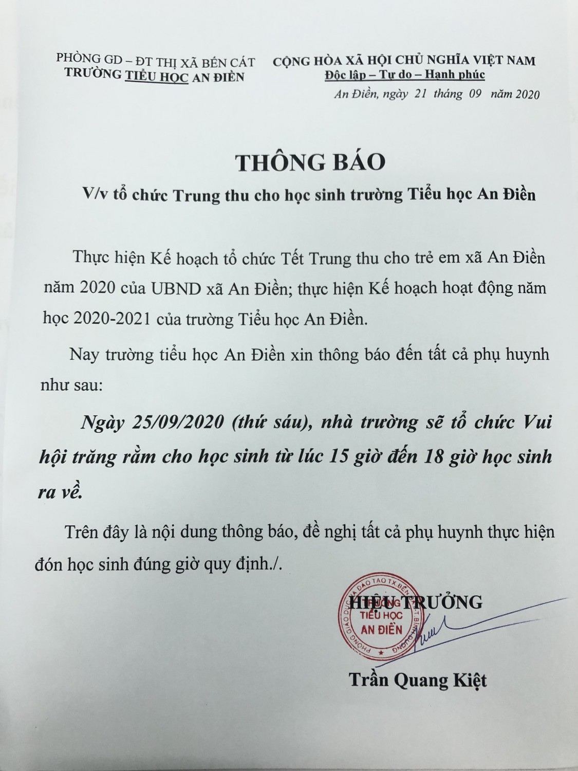 Chiều ngày 25/09/2020, Trường Tiểu học An Điền tổ chức vui hội trăng rằm cho các em học sinh vào lúc 15h đến 18h.